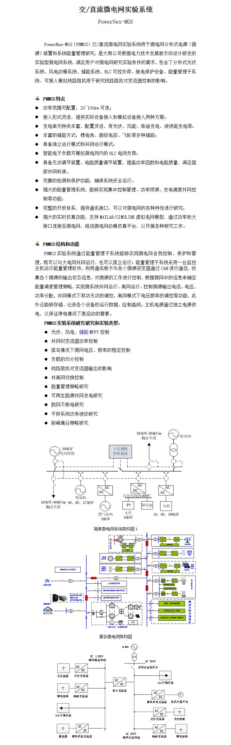 PowerNex-MGS(PNMGS)交/直流微电网实验系统用于微电网分布式电源(微源)装置和系统能量管理研究,是大周公司根据电力技术发展新方向设计研发的实验型微电网系统,满足用户对微电网研究实验条件的需求,包含了分布式光伏系统、风电动模系统、储能系统、RLC可控负荷、继电保护设备、能量管理子系统、可接入模拟线路阻抗用于研究线路阻抗对变流器控制的影响。